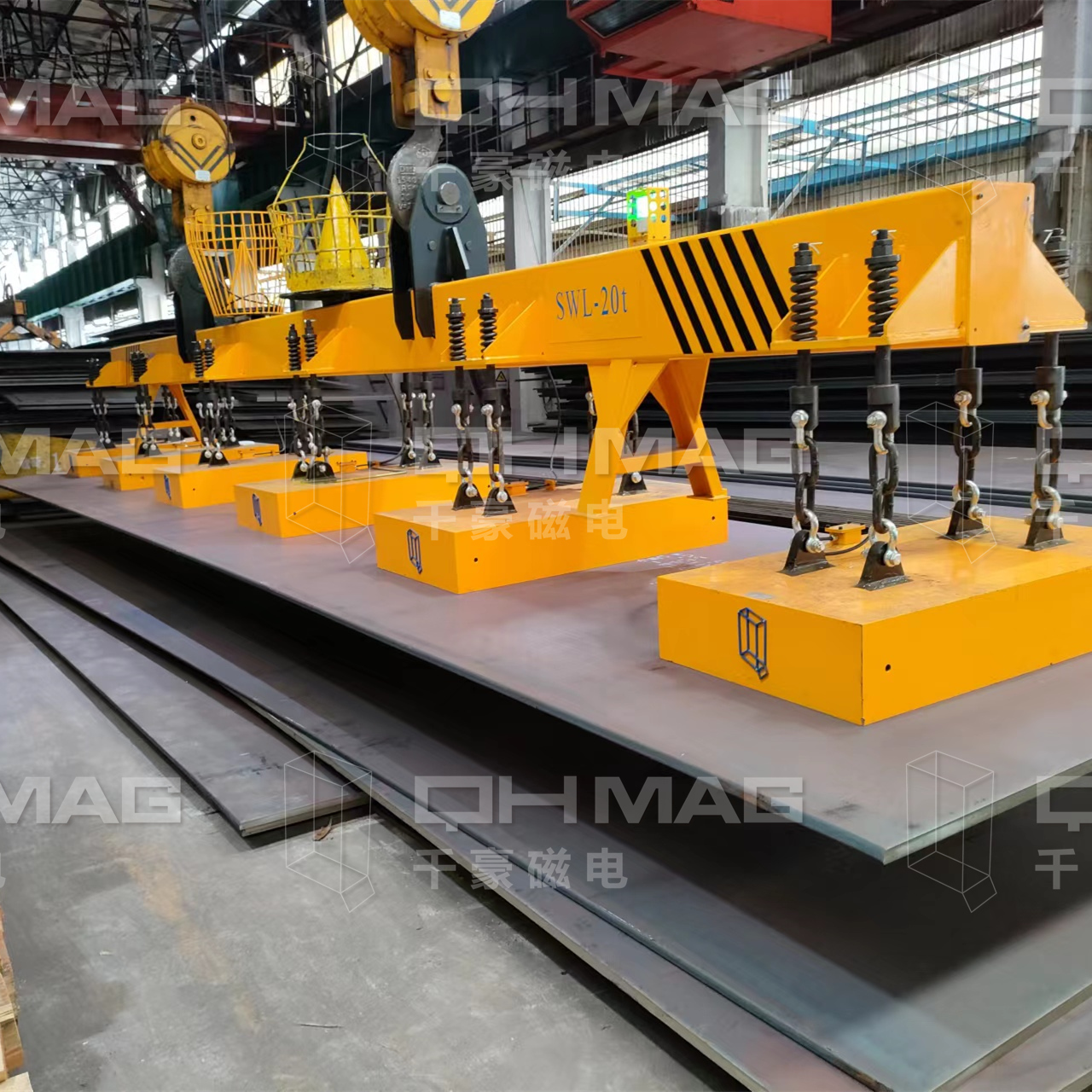 千豪磁電電永磁吊具可實(shí)現(xiàn)多張鋼板同時(shí)起吊,能適應(yīng)一定量的擾度變形,抗氣隙能力強(qiáng),多檔調(diào)磁,可實(shí)現(xiàn)多張起吊,單張放料。本次吊運(yùn)要求:鋼板溫度≤300℃,安全吸放多張鋼板能力要求根據(jù)鋼板厚度、鋼板寬度、鋼板長(zhǎng)度來(lái)設(shè)計(jì)安全吸吊能力(張數(shù))。此款電永磁吊具可實(shí)現(xiàn)最多8張鋼板的吊運(yùn)。